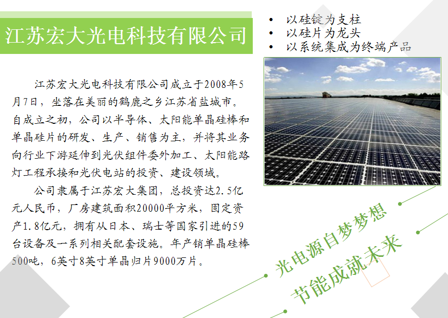 江苏宏大光电科技有限公司成立于2008年5月,主要从事太阳能硅片及半导体硅片的技术研发、制造,节能产品的技术开发及技术咨询服务,屋顶太阳能电池组件,太阳能光伏亮化工程,照明工程安装。自成立之处,公司以半导体、太阳能单晶硅棒和单晶硅片的研发、生产、销售为主,并将其业务向行业下游延伸到光伏组件委外加工、太阳能路灯工程承接和光伏电站的投资、建设领域。