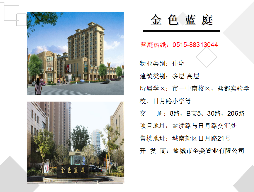 盐城市全美置业有限公司成立于2010年3月,注册资本2000万元,由江苏宏大投资有限公司和江苏广益来置业有限公司合资设立,2013年出品金色蓝庭楼盘。作为南城区的新起之秀,以良好的品牌口碑和过硬的楼盘特色得到了盐城市民的认可和好评。